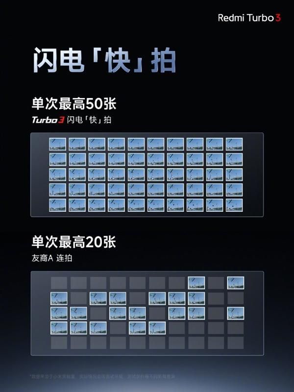 拍摄方面,新机在第三代骁龙8s移动平台运算能力与ISP处理能力驱动下,以及小米影像大脑深度赋能,Redmi Turbo 3实现了30张/秒的闪电连拍。