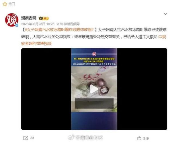 在大窑狂揽数十亿营收之际,旗下产品却忙着四处偷袭消费者。2023年,江苏扬州的王女士在将网购的大窑汽水放入冰箱时,突然发生爆炸,导致其右眼受伤,进行多次手术。