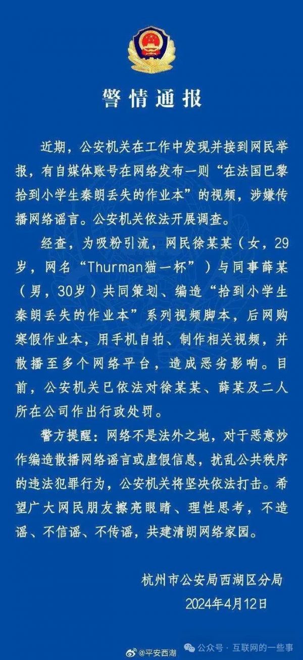 一名拥有千万粉丝的博主“Thurman猫一杯”发布视频称,在法国巴黎捡到了两本国内一年级学生的寒假作业,并寻找失主“一年级八班秦朗”。视频迅速走红,登上热搜榜。