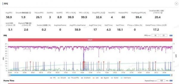 30分钟的极限测试,几乎都在战斗,平均帧率达到了58.9帧,全程没有降频,这个成绩非常棒。