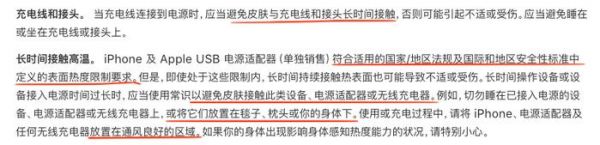 除了建议使用符合国家标准的电源适配器、数据线等常规建议之外,苹果还特别提到在充电时,避免皮肤长时间接触充电头和接头,特别是不要睡或者坐在这些设备上面,这样很容易导致接触面受伤。