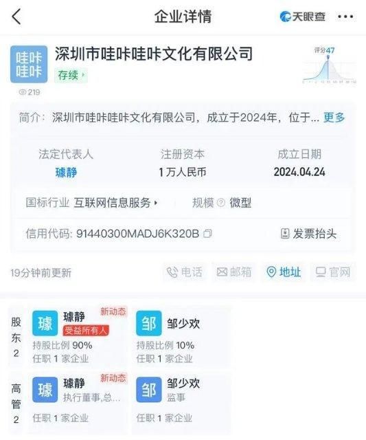 天眼查信息显示,今年4月24日深圳市哇咔哇咔文化有限公司成立,该公司法人为璩静。公司经营范围包括日用品销售、家电销售、通讯设备销售、服装服饰零售、文化娱乐经纪人服务等。据第一财经报道,相关人士告诉记者,该公司法人即为刚刚离职的百度副总裁璩静,持股比例90%。另一名持股10%的股东邹少欢是璩静在百度任职期间的助理。