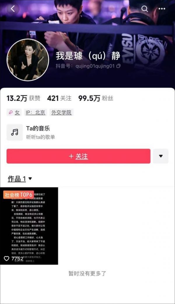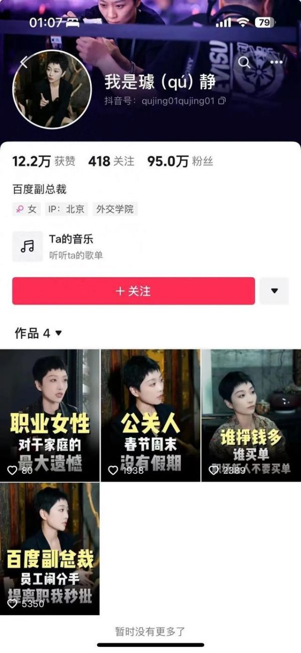 据媒体此前报道,5月以来,一个简介为百度副总裁璩静的账号开始发布视频,分享职场经历和思考。在其发布的第一条视频中,她用辛辣的语气提到“员工闹分手提离职我秒批”,表示和员工只是雇佣关系,没有义务去了解其个人情况。随后,璩静下架了所有视频。
