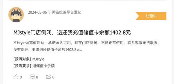 在黑猫投诉上搜索MJstyle相关内容,可以看到,最近,关于退储值卡的申诉明显增多,问题主要集中于人工客服消失不回复,小程序订单不发货,以及储值卡登记退款后被清零却没有收到打款等。其中,未使用余额达数千元的消费者不在少数。