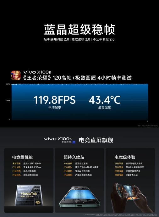 X100s,全球首发蓝晶×天玑9300+,全大核再进化,CPU 主频最高 3.4GHz,安兔兔跑分 230万+;