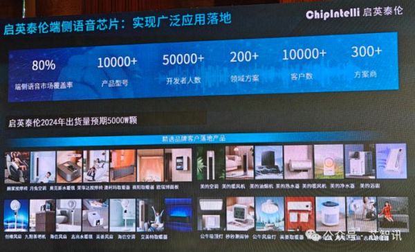 此外,启英泰伦还提供多种应用方案,覆盖智慧家居、智慧酒店、智慧安防、智慧教育、智慧汽车和机器人等多个领域。目前,启英泰伦在端侧语音市场的覆盖率达到80%,已经落地的产品型号超过1万款,开发者人数超过50万。启英泰伦面向各个领域的方案超过了200个,拥有超过300家的下游方案商和超过10000家客户。