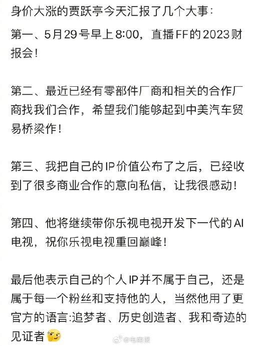 身价大涨的贾跃亭汇报大事,带货救FF有望了?各行业品牌发出合作邀请,七年没联系的乐事电视都主动联系他了。