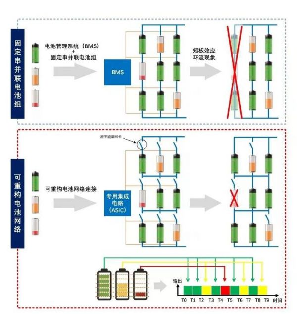 动态可重构电池网络与固定串并联电池组的电池管控原理对比示意