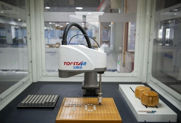 在广东拓斯达科技股份有限公司的展示平台区,一台工业机器人在用棋子拼写字母。(新华社)