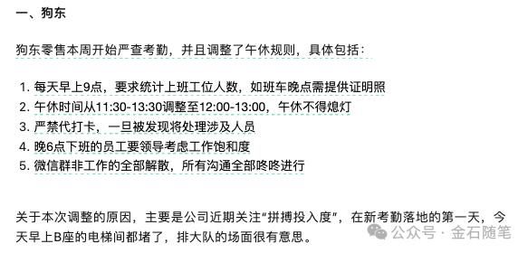 业绩大幅放缓之下,近期京东裁员和京东考勤事件已火遍全网。618临近,京东的管理层发现大家拼搏不足,于是在5月20日下午,京东零售一张考勤截图刷屏,主要内容是:早晨9点统计工位人数;午休时间从11点30分至1点30分调整至12点到13点,午间不得熄灯;晚6点下班的领导会考虑你的工作饱和度;非工作微信群全部解散。