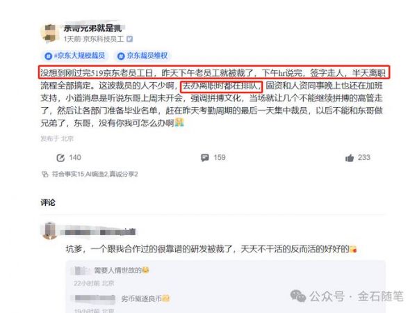 在社区平台,多个京东童鞋反馈京东再度启动裁员或直接辞退。1)刚过完5.19日京东老员工日,昨天(20日)下午老员工就被裁了,下午hr说完,签字走人,半天离职流程全部搞定。这波裁员不少,去办离职时都在排队。