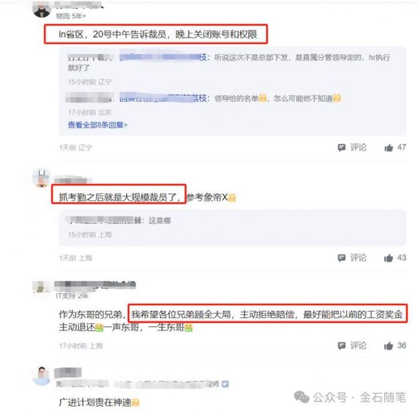 考勤抓严还没反应过来,京东就开始了大规模裁员。有京东童鞋反馈:20号中午告诉裁员,晚上关闭账号和权限,贵在神速。有童鞋爆料,谁工资高裁谁?(当然是底层打工人)。