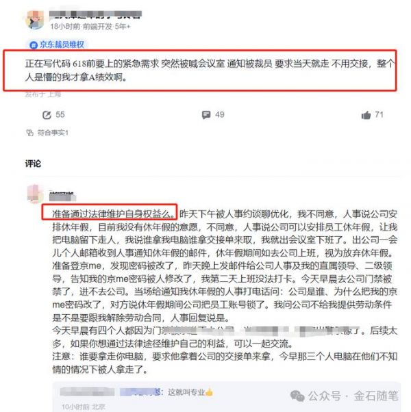还有童鞋反馈,正在写代码,618前要上的紧急需求,突然被喊会议室,通知被裁员,要求当天就走,不用交接,整个人是懵的,关键还是A绩效。另外还有一位童鞋打算通过法律维权了。