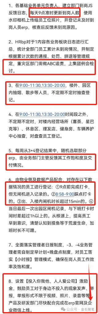 随着裁员发酵,京东最新考勤制度全文来了。这考勤制度简直炸裂:9点没到岗,核查原因,掐点到岗的要进行登记;考勤重灾区,上集团例会检讨;下午1点30分到20点,在楼外抽烟、散布也要严查登记;每周抽查erp反馈工作饱和度;鼓励员工相互举报、拍照等等。