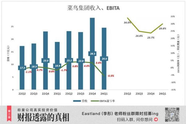 2024年第四财季(2024年Q1自然季),国际数字商业营收同比增长56%。菜鸟没有掉队,营收增长接近30%。代价是财季EBITA亏损13.4亿(其它三个财报EBITA利润分别为8.8亿、9.1亿、9.6亿)。
