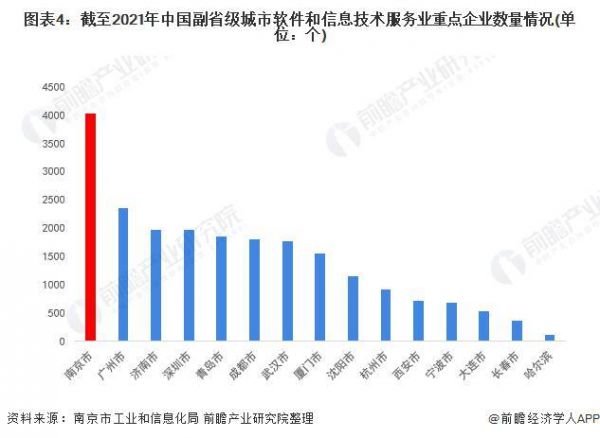 依托较为完善的电子信息制造产业链,南京市也聚集了众多软件和信息技术服务业重点企业。目前,江苏是全国软件和信息技术服务业重点企业分布最多的省份,而截至 2021 年,南京市全国软件和信息技术服务业重点企业数量达到 4020 个,是中国软件和信息技术服务业分布最多的副省级城市。
