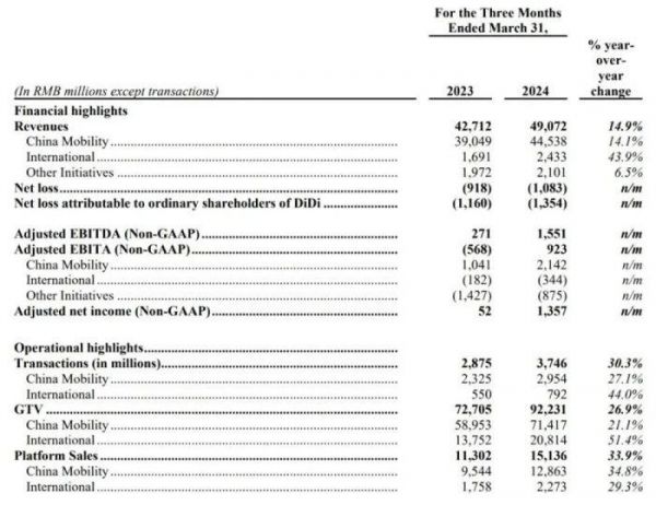 5月29日,滴滴在其官网发布了2024年第一季度业绩报告,总收入为491亿元,同比增长14.9%。非美国通用会计准则下,经调整EBITDA盈利16亿元、EBITA盈利9亿元;回顾上年同期,前者是盈利3亿元,后者是亏损近6亿元,改善非常明显。