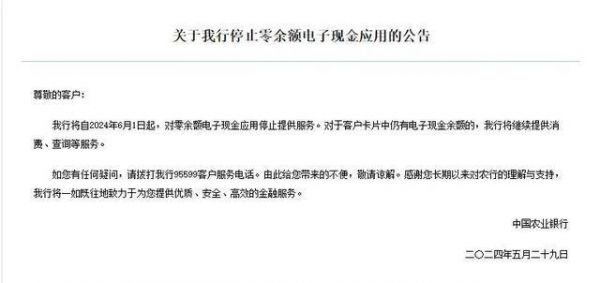 5月29日,中国农业银行发布公告称,该行将自2024年6月1日起,对零余额电子现金应用停止提供服务。对于客户卡片中仍有电子现金余额的,将继续提供消费、查询等服务。
