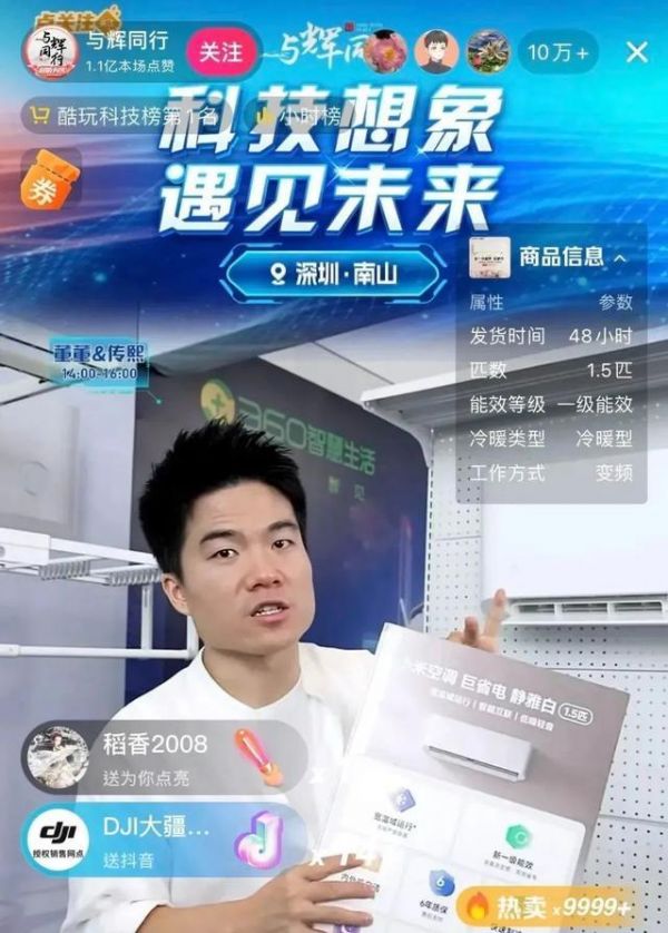 截图自“与辉同行”直播间本次直播采用室内定点带货和室外直播演出两种形式,借助董宇辉“头部主播”的影响力和号召力,向全国网友推介深圳南山文旅以及“南山智造”热门科技产品。据统计,此次专场直播累计观看人数近2000万,点赞数达2.3亿次;整场稳居抖音小时榜、带货总榜第一。