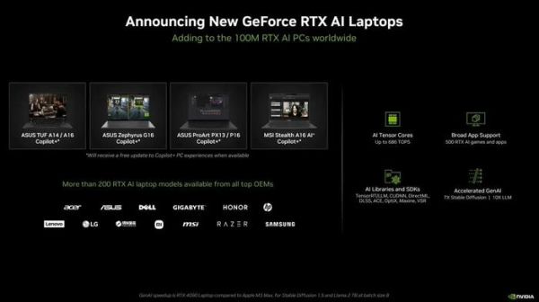 首批适配的设备包括来自华硕的五款笔记本电脑以及来自微星的一款机型,由于 Copilot+ 目前尚未正式发布,这些笔记本电脑将预装常规版本的 Windows 11,但英伟达承诺,一旦 Copilot+ 上线,这些设备都将可以免费获得所有更新。