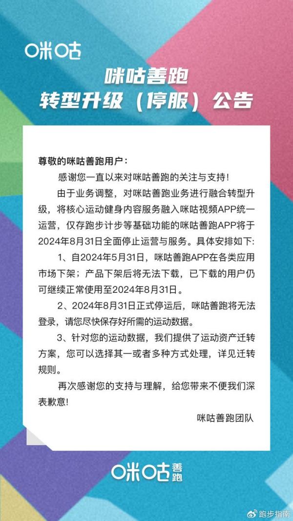 在5月31日,咪咕互娱旗下的跑步APP咪咕善跑突然宣布停服公告。根据公告内容,由于业务调整的需要,咪咕善跑将于2024年8月31日全面停止运营与服务。