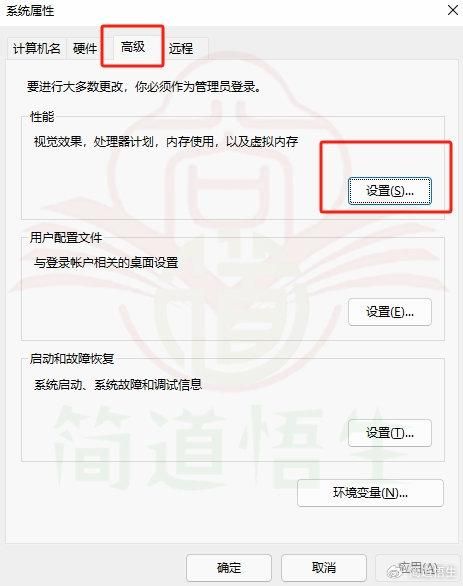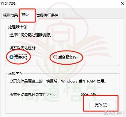 ③点到上图中的“高级”选项,再点击“性能”右下角的“设置”,会弹出“性能选项”对话框(如下图),也点到“高级”: