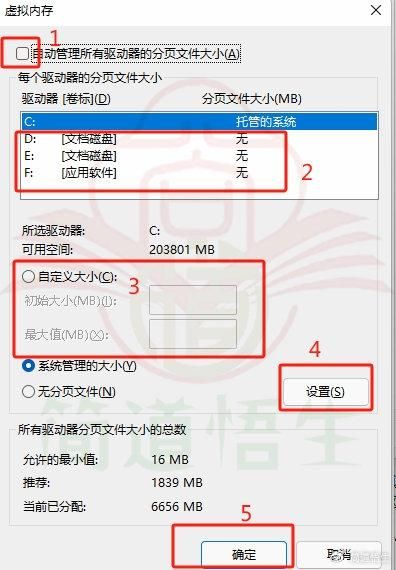 这里也有需要注意的点:如果点了图中的1-自动管理所有驱动器的分页文件大小,其他就不需要操作了,直接点5确定即可。如果不在1框中打勾,就可以自定义设置虚拟内存,按图中操作2、3、4即可。备注:设置虚拟内存最好选C盘之外的其他几个盘,选中盘符后点3自定义大小。看截图下方有提示,允许的最小值为16M,所以最小值即可设为16M,最大值为物理内存的2-2.5倍。(物理内存即内存条的容量,如果是16G内存,最大值就是33280)。