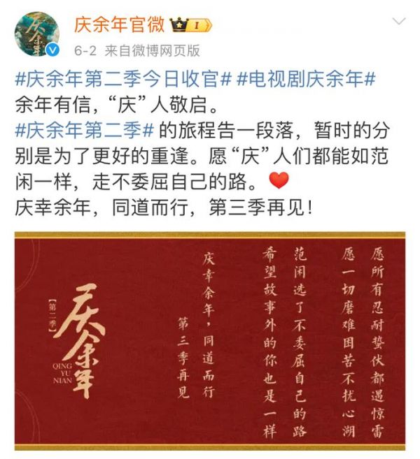 6月2日晚,电视剧《庆余年》发出微博,庆祝第二季收官:“庆幸余年,同道而行,第三季再见!”