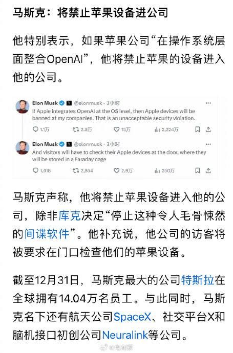 #马斯克回应苹果OpenAI合作# 苹果宣布与OpenAI合作,整合ChatGPT!马斯克怒了:公司将禁用苹果。 #苹果官宣ChatGPT集成于全系统生态#