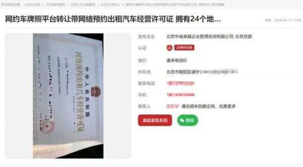 新浪科技在一家名为顺企网的B2B网站上看到,确实存在着不少转让网约车平台牌照的交易信息,这些信息大多由相关中介公司发布。