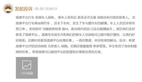 在黑猫平台上,存在着不少针对聚合平台司机资质、物品遗失、损失理赔等方面的投诉。一位用户就投诉称,在高德平台打车乘坐网约车,还未下车时,发生了车与摩托车的碰撞。就医后检查出颅内受损以及右胳膊麻木,起初高德客服专员说车内有乘车人员保险可以赔付医疗费用,但后期一直在推诿,并没有得到解决。