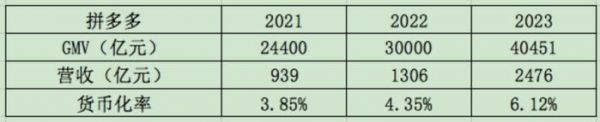 数据显示,2023年拼多多表面的货币化率已经大幅提升至6.12%,比2022年高出1.77个百分点,非常夸张。