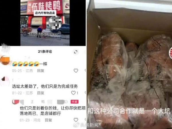 “加盟前品牌号称选址专业、线上运营能力超强、供应链强大优势,结果真正落地后,各种问题频出。公司主要靠卖底料赚钱,一桶辣椒油1000元,一桶普通的鸭油要150元,从总部进货的成品冻鸭根本不能用,烤的不熟,都是鸭腥味,顾客反映嚼不动。由于门店不开了,联系把物料退回去,但是公司没人理,最后低价卖给了同行,我赔了8000多块。”他吐槽说。