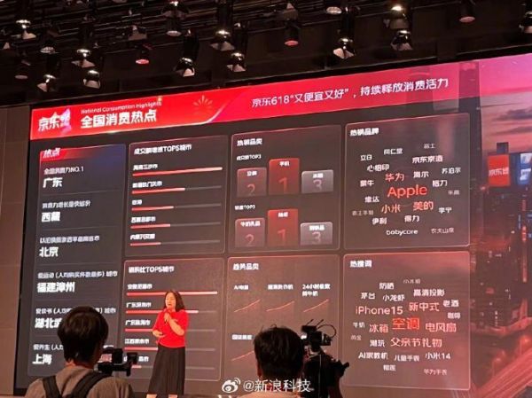 【京东公布618数据:#苹果成京东618最热销品牌##618国货流量走向新中式#】在京东618媒体开放日上,消费及产业发展研究院刘琦公布了今年618的消费趋势,其介绍道,在今年618中,广东成为全国消费力最高的省份、西藏为消费力增长最快省份、北京为以旧换新渗透率最高省市、福建漳州为爱运动(人均购买件数最多)城市。
