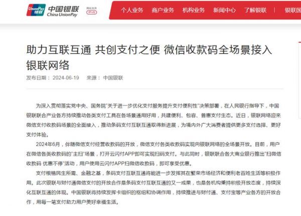 2024年6月,伴随微信支付经营收款码的开放,微信支付各类收款码实现向银联网络的全场景开放。目前,用户在微信各类收款码的“主扫”场景,打开云闪付APP即可实现扫码支付。