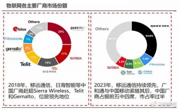 目前全球物联网模组行业市场格局中,移远通信、广和通、中国移动、日海智能四大厂商在2023年已经占据全球50%以上的市场份额,中国厂商已经拥有明显的领军优势。
