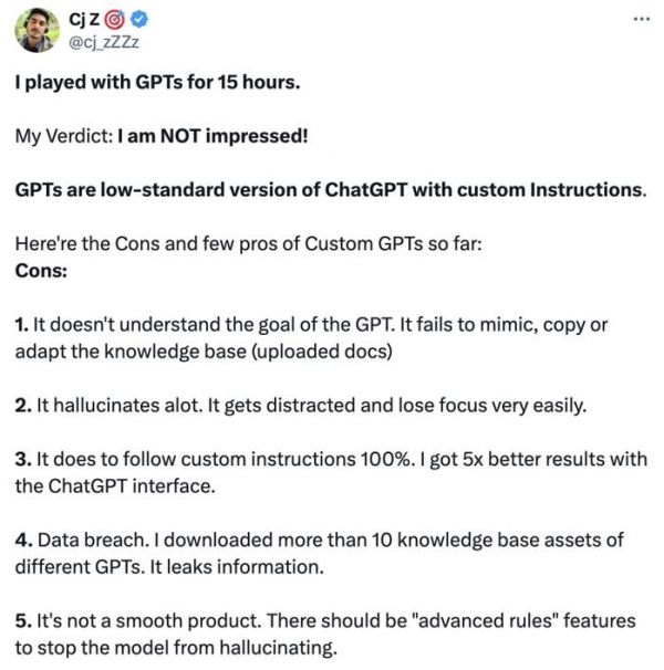 但也正是由于创建门槛低,大家发现只用简单prompts调出来的定制GPT,体验其实和直接对话GPT-4没太大差别,甚至还是个“低配版”:它不能适应知识库、容易分心和产生幻觉;不能100%遵循自定义指令,反而 “在ChatGPT界面得到的回答效果要好5倍”;本质相当于基础RAG平台,却最多只能传10个文件,未能提供向量数据库调用等功能。而且容易实现也就意味着容易被替代,几百万个GPTs同质化严重、良莠不齐,真正优秀的却少之又少。