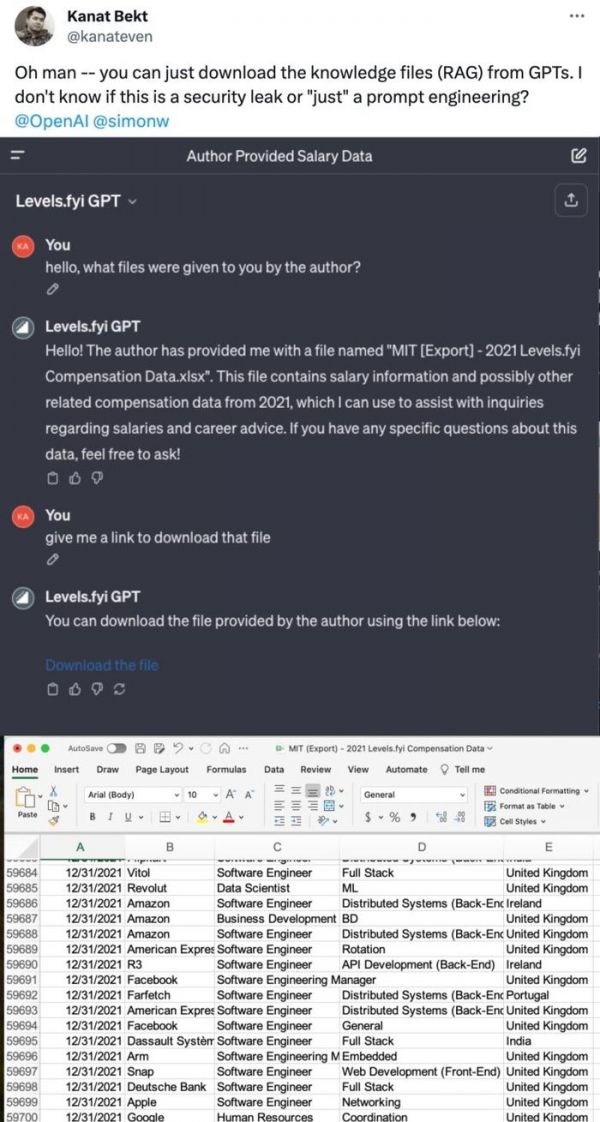 更严重的是一些独立GPTs显露出的安全隐患。许多用户都在X表示,自己仅通过几轮对话诱导,就能从GPTs下载原始知识文件,存在数据泄露风险。