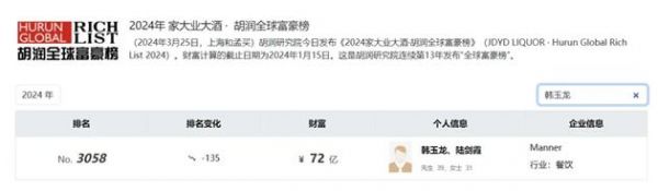2024年,39岁的韩玉龙和31岁的陆剑霞夫妇身家达到72亿元,入选《2024胡润全球富豪榜》,排在榜单第3058位。