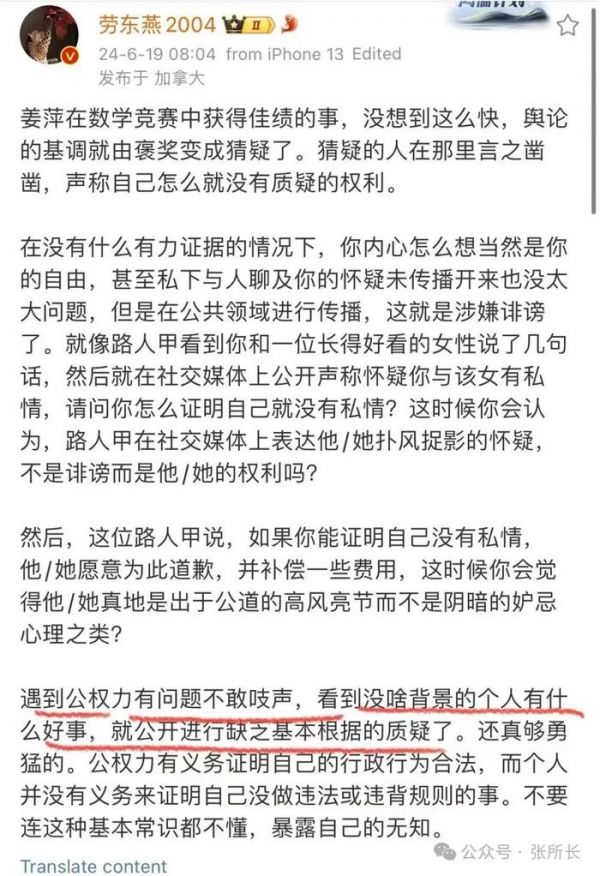 3,劳教授说,对公权力不敢吱声,看到没啥背景的,就敢公开质疑了。这个结论是劳教授自己臆想出来的。我因为批评和质疑,被封了5个公众号了。我相信,很多质疑姜萍的人,跟我一样。只是质疑的声音,发不出来了而已。