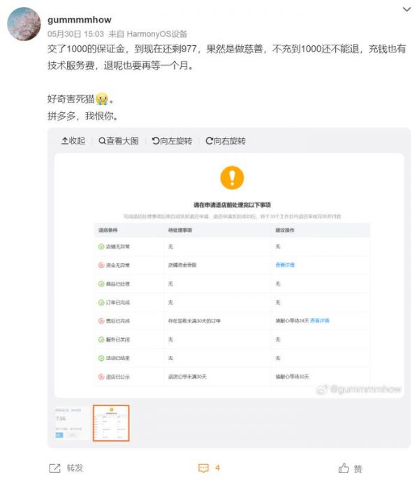 值得一提的是还有商家指出,如果在拼多多上开店没有交保证金,当想要关闭店铺的时候,需要补缴欠平台的服务费,否则无法关闭店铺。