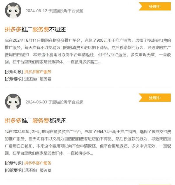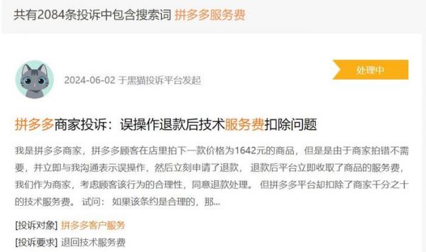 值接Talk发现,目前在黑猫投诉上,关于拼多多服务费的投诉超过了2000条,部分商家认为拍后申请退款收取技术服务费的规则,并不合理。
