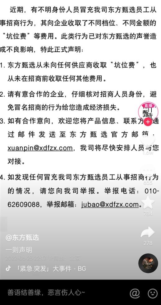 2022年6月23日,东方甄选也曾发布声明称,近期有不明身份人员冒充公司员工,从事招商行为,向企业收取不同档位、不同金额的“坑位费”等费用,声明强调东方甄选从未向任何供应商收取“坑位费”,也从未在招商前收取任何其他费用。