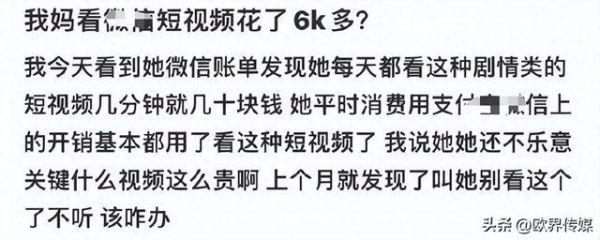 #我妈看微信短视频花了六千多#话题登上热搜。这位博主表示她的母亲看的是一些小程序里的短剧,每集仅2分钟,但收费高昂,有39元和49元两个价格档位。 今年,短剧确实火了一把,很多作品都赚得盆满钵满。几分钟一集、上百集一部,15秒一个反转,30秒一个推进,最后再留个悬念。这些短剧对中老年人的收割极为厉害,利用中老年人的心理弱点,设计各种诱惑,让人欲罢不能。