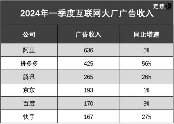 2023年,广告收入最多的大厂是阿里,以3008亿元(其中有一部分是佣金)排在第一;拼多多以1535亿元排在第二;腾讯以1015亿元排在第三;再往后是京东,847亿元;百度以751亿元排在第五;快手广告收入增长23%达603亿元,加速缩小和百度的差距。
