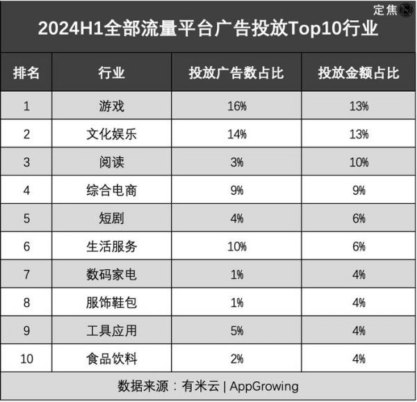 有米云向「定焦」提供的数据显示,2024年上半年,移动端全部流量平台广告投放前十的行业,排在前五的分别是游戏、文娱、阅读、电商、短剧。其中前三个行业的投放金额占比均超过10%,电商占9%。