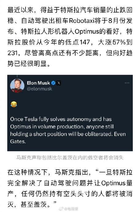#马斯克喊话要灭了比尔盖茨# 马斯克霸气喊话:一旦实现全自动驾驶、机器人量产,特斯拉空头都会被消灭,即便是比尔盖茨。
