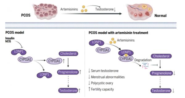 2024年6月13日,复旦大学基础医学院团队联合复旦大学附属中山医院团队,合作在《科学》(Science)杂志上在线发表了关于青蒿素研究的最新成果——《青蒿素类衍生物可通过增强LONP1-CYP11A1互作治疗多囊卵巢综合征》(Artemisinins ameliorate polycystic ovarian syndrome by mediating LONP1-CYP11A1 interaction),研究团队发现青蒿素类衍生物能够显著改善多囊卵巢综合征的疾病表型。