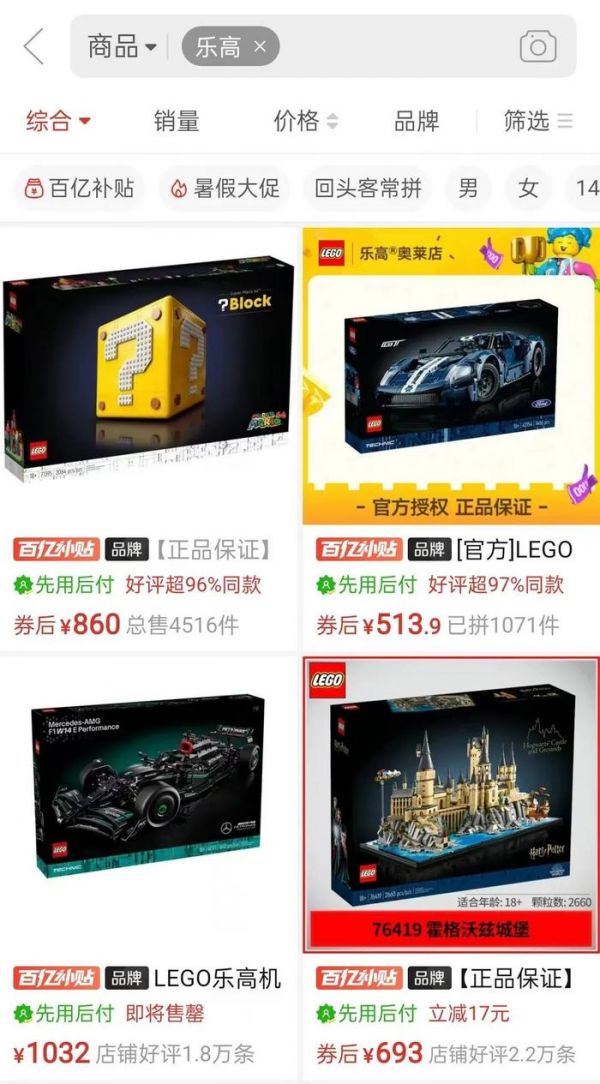 在三个平台分别搜索“乐高”,京东、淘宝第一个跳出来的都是乐高旗舰店,而拼多多跳出来的是带有“百亿补贴 品牌”字样的产品,这些产品找不到一个具体的店铺,而是汇聚在拼多多的“品牌”乐高页面中。