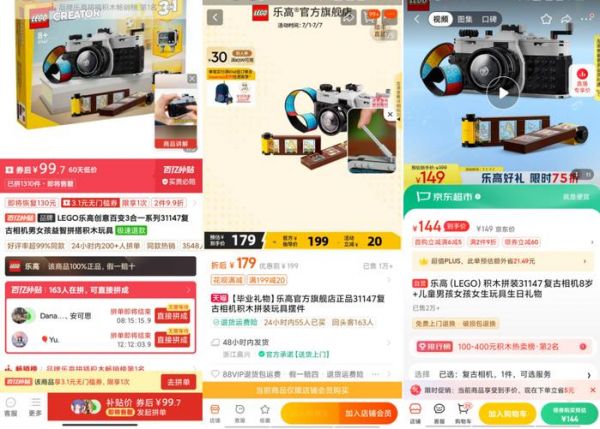 复古相机在拼多多乐高品牌卖99元,但在淘宝卖179元,京东卖144元。拼多多比淘宝的价格低了44%,比京东的价格低了31%。